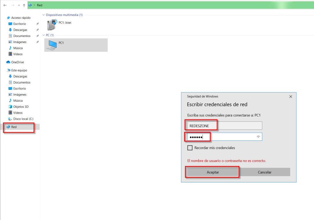 Aquí lo que tenemos que hacer es poner la cuenta de usuario que creamos junto con su contraseña. Si pulsamos en la casilla «Recordar mis credenciales» ya no hará falta que tengamos que volver a meter la password. A continuación, pulsamos en el botón Aceptar.