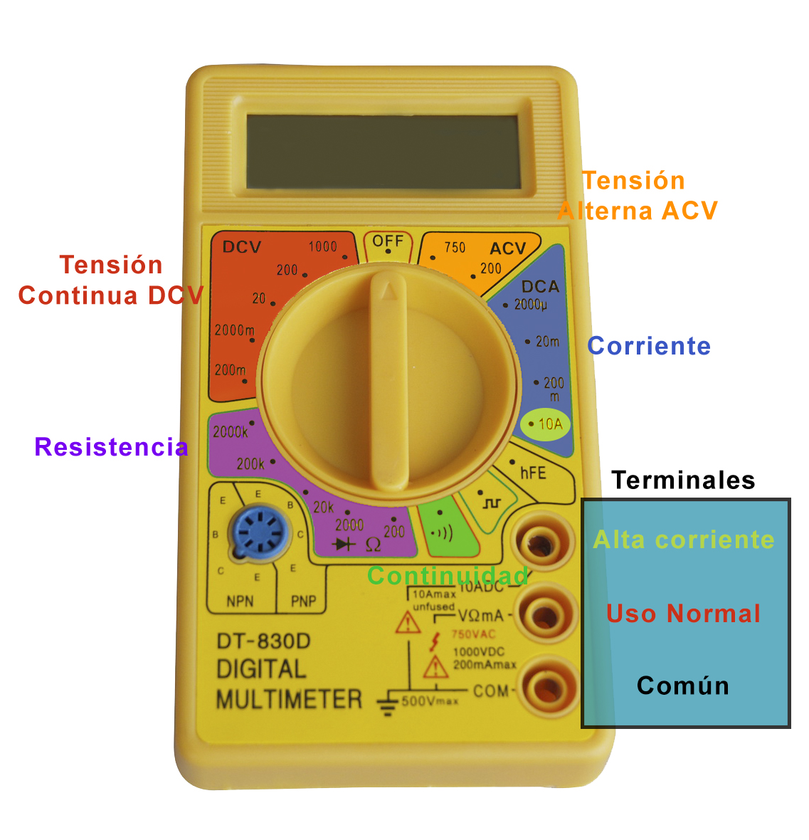 (en nuestro caso un polímetro con el selector puesto para medir intensidad)