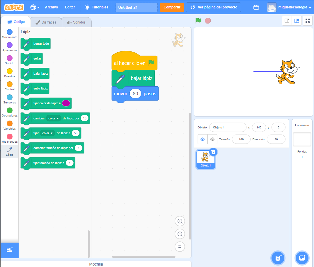 1. Utiliza el gato para dibujar una línea de 180 pasos.