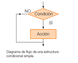 a) Estructura condicional simple. Consiste en el hecho de que, si se cumple una condición se ejecutará una acción, y si no se cumple no se ejecuta.