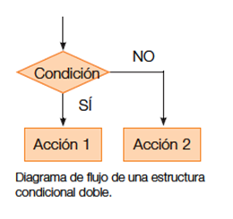b) Estructura condicional doble. Consiste en el hecho de que, si se cumple una condición entonces se lleva a cabo una acción, y si no se cumple se ejecuta otra acción distinta.