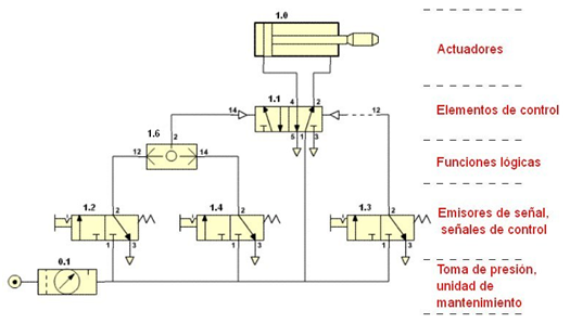 Cuando se activa la válvula 1.2, el aire llega hasta el cilindro por la